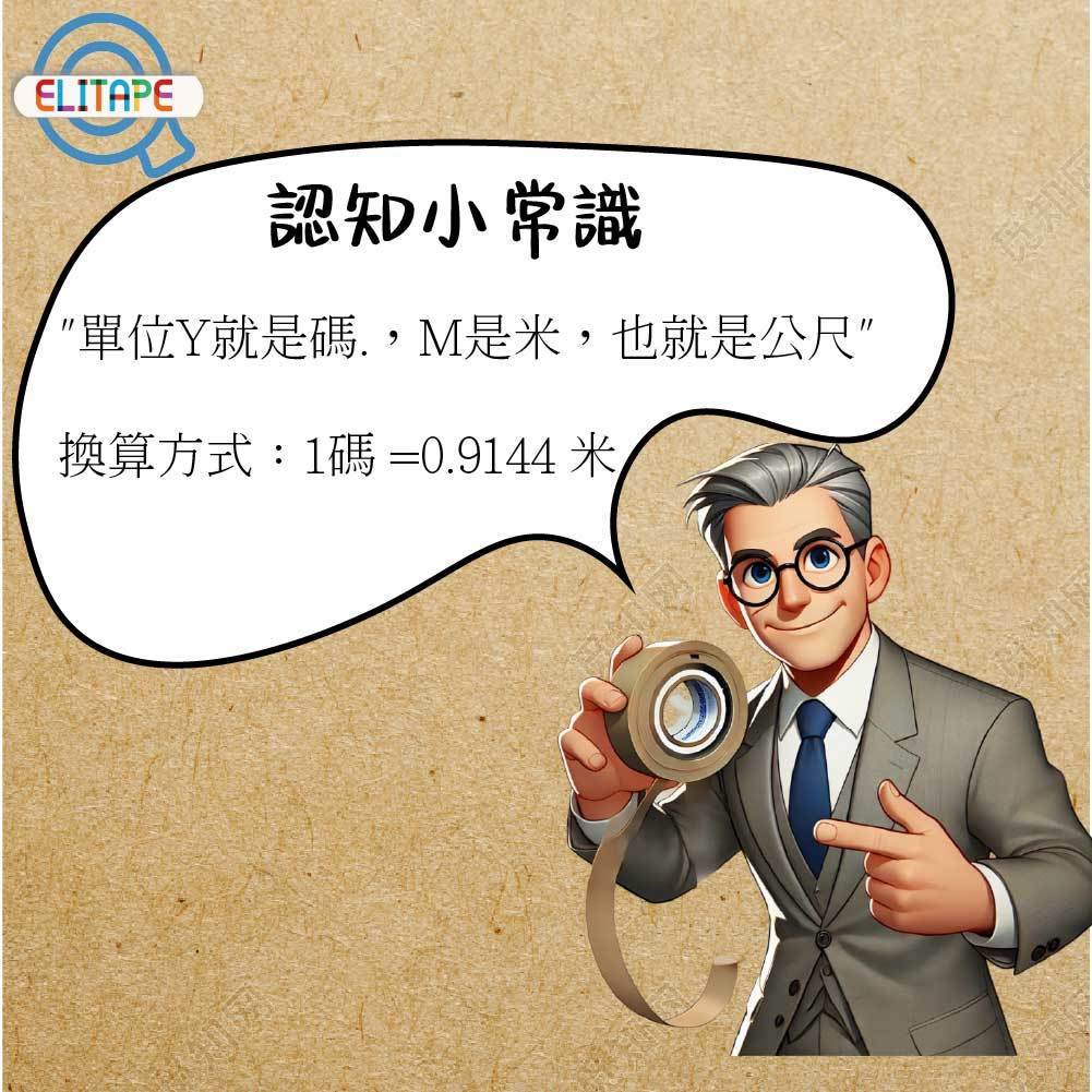 1)一般市面常見膠帶長度標示單位多為Y(單位是碼),1Y就是0.914米(M),在選購膠帶時,記得拿出計算機按按看再比價,以免被單位的不同給混淆買貴了喔。