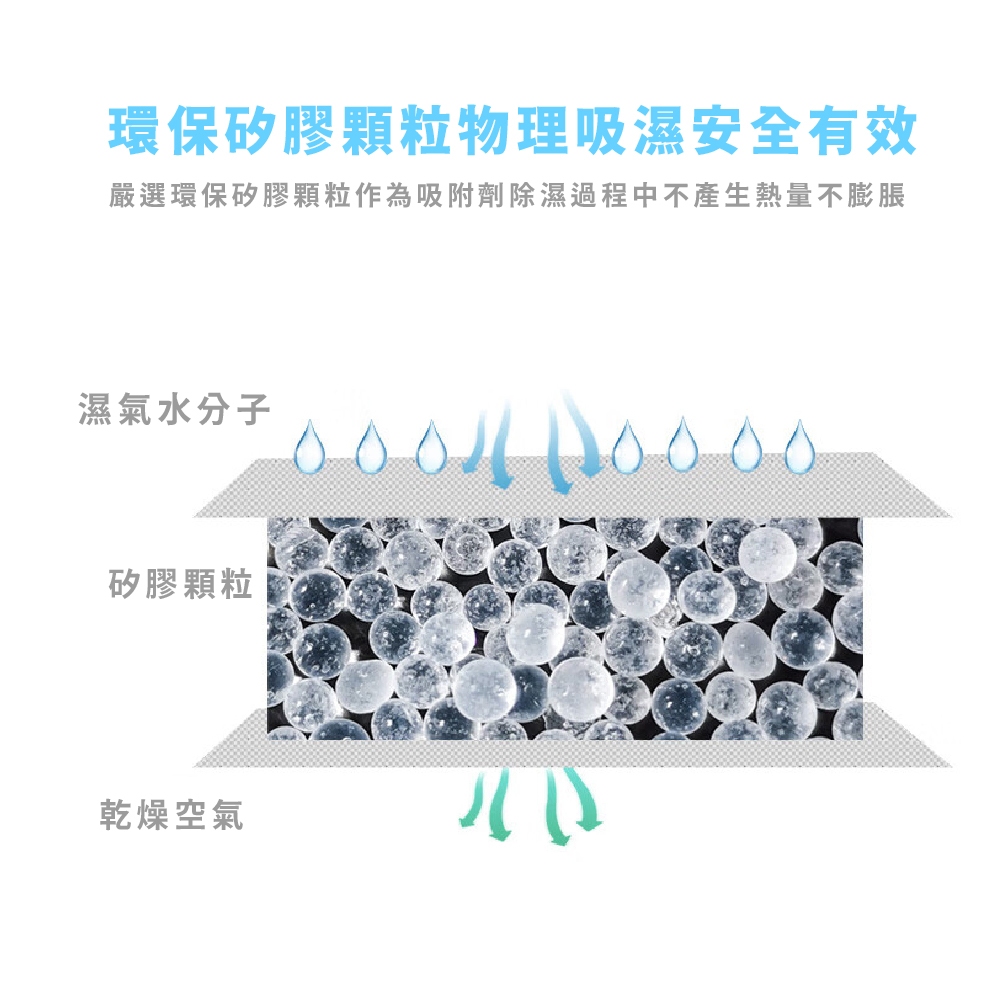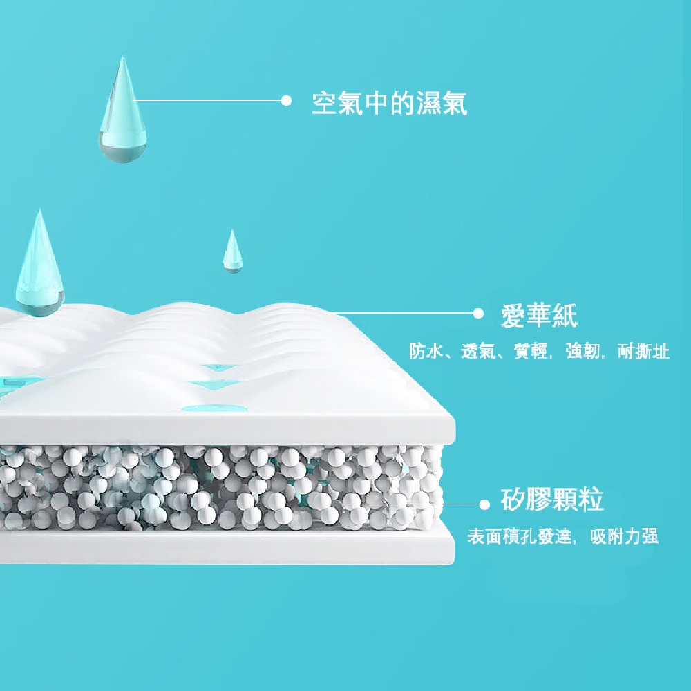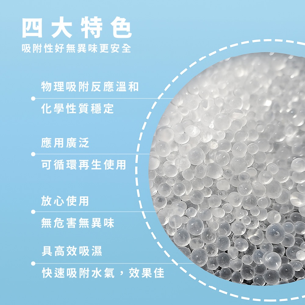 1)食品級矽膠顆粒:物理吸附水氣,無毒、無味、安全可靠。